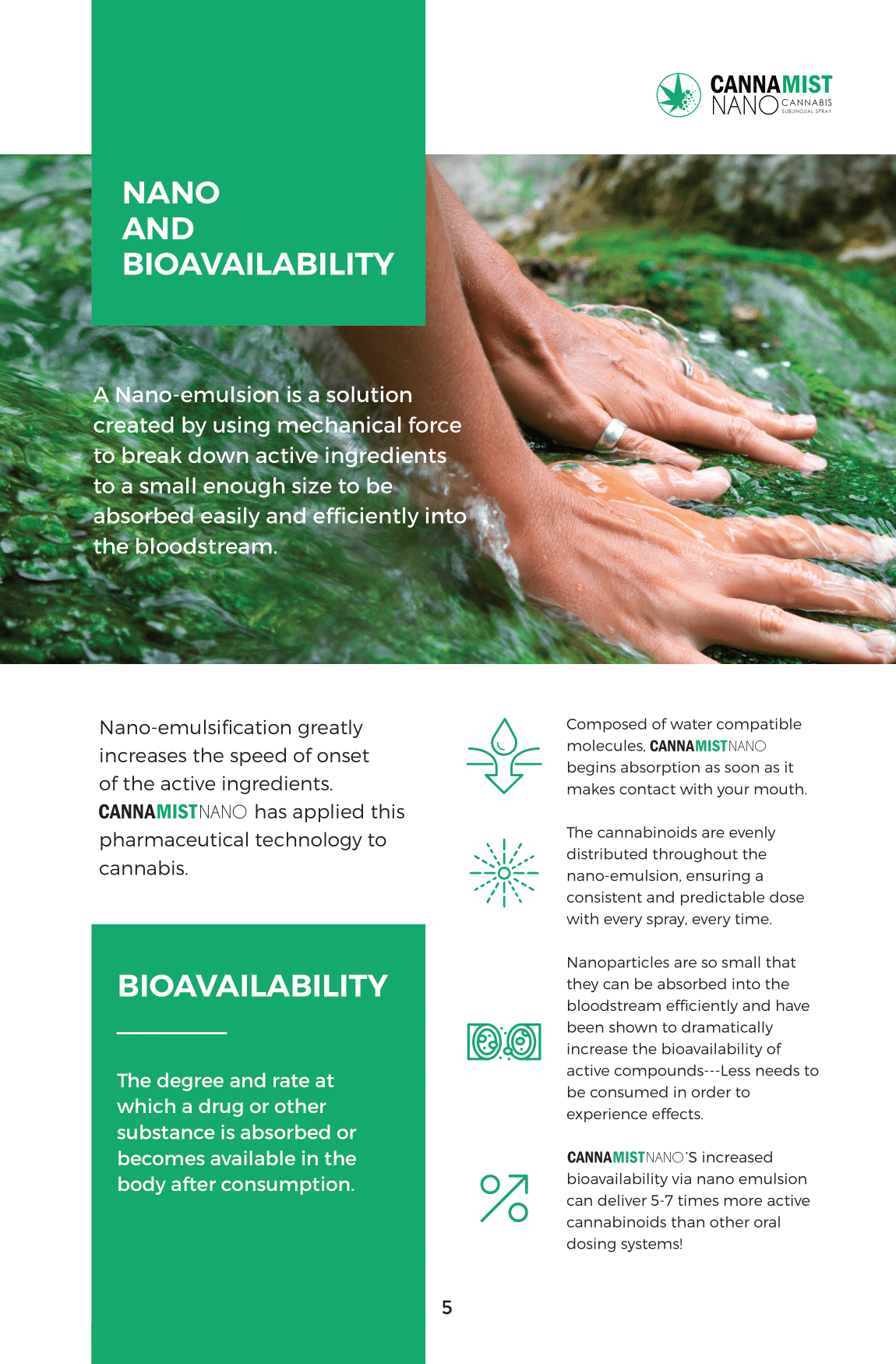 A Nano-emulsion is a solution created by using mechanical force to break down active ingredients to a small enough size to be easily absorbed. Nanoparticles are so small that they can be absorbed into the blood stream efficiently and have been shown to dramatically increase the bioavailability of active compounds. Less needs to be consumed in order to experience effects. In addition, Nano-emulsification increases the speed of onset of the active ingredients. CANNAMISTNANO has applied this pharmaceutical technology to cannabis. Being comprised of water compatible molecules, it begins being absorbed as soon as it makes contact with your oral mucosa. The nano-sized cannabinoid particles are less than 22 nanometers in diameter, allowing them to effortlessly pass through the mucosal membranes resulting in fast onset. The cannabinoids are evenly distributed throughout the nano-emulsion, which ensures a consistent and predictable dose with every spray that provides 5-7 times more bioavailability of the active cannabinoids compared to other oral dosing systems.